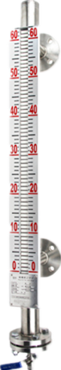 磁翻板液位计是根据浮力和磁耦合原理研制的。这种液位计一般采用磁致伸缩原理,通过波导线传输磁浮子的信号,然后通过电路处理得到液位值。当被测容器中的液位上升和下降时,液位计主体管中的磁浮子也会上升和下降,当液位上升时,浮子中的磁钢通过磁耦合器驱动红,白翻柱转180°传输到磁翻转柱指示器,翻转柱由白色变为红色,当液位下降时,翻转柱由红色变为白色,指示器的红白交界处为容器内液位的实际高度,以实现液位的清晰指示。在高温、高压、高粘度、强腐蚀条件下,可实现高密封、防泄漏、安全可靠的液位测量。可用于各种塔、罐、罐、球罐、锅炉等设备的介质液位检测.