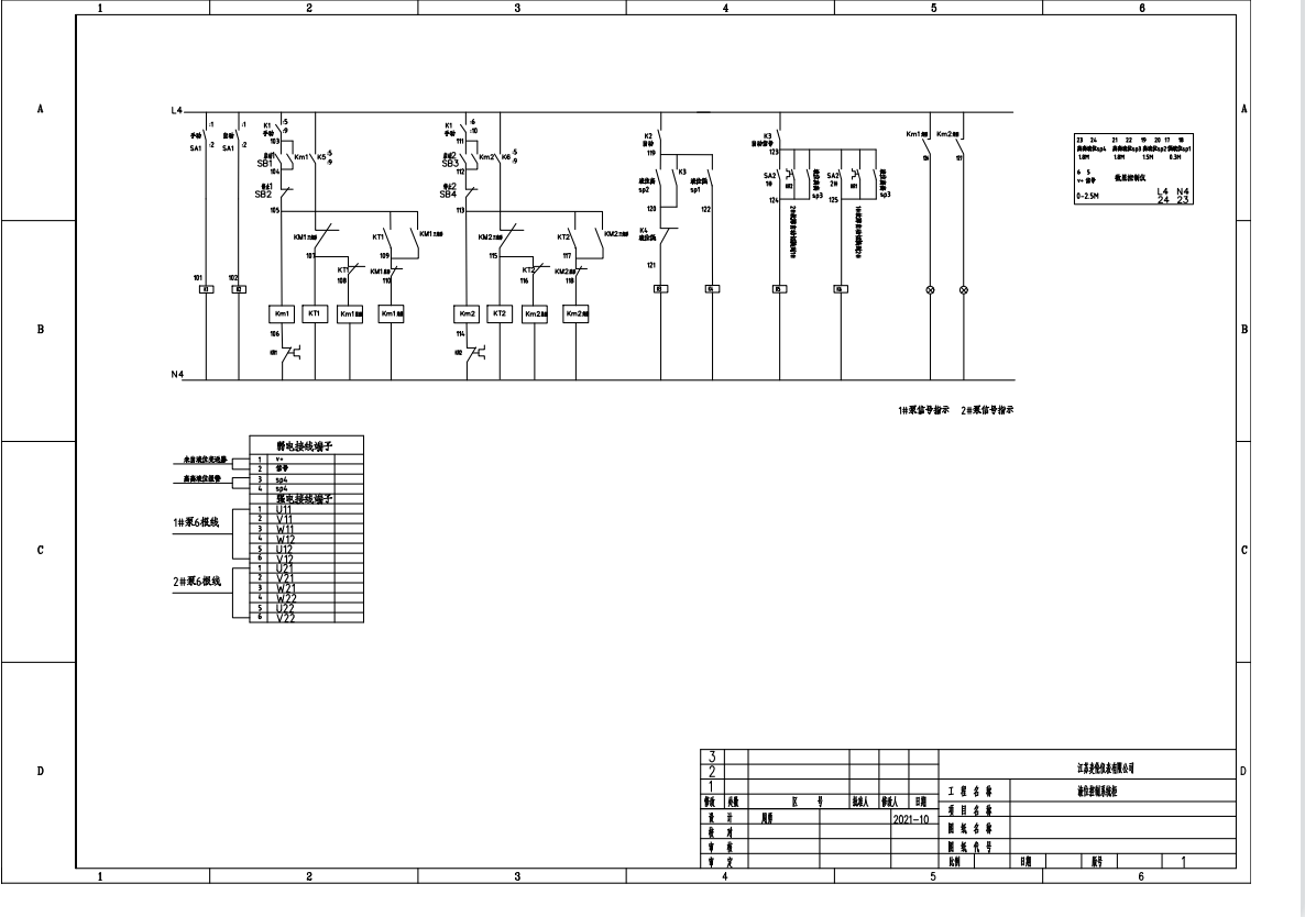 液位控制报警工作原理: 首先按下变压器一次侧开关 X按钮,变压器通电,xd4指示灯亮。当液位低时,按an1。此时,通过an2、K2、J2-1常闭触点形成电路,J1通电,端子板上3和4之间的J1触点闭合,以控制泵。如果泵的电机为0.5KW,则可直接从此触点启动。无需触点接触器线圈可通过使用端子板上的3和4触点进行控制; J1线圈通电后,泵启动。