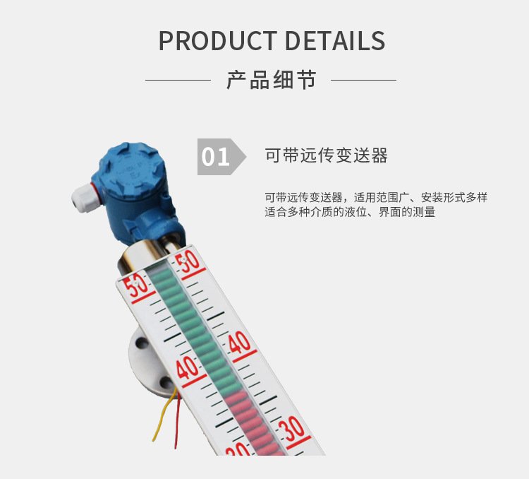 磁翻板液位计简介;磁翻板液位计的原理非常简单。它根据浮力和磁耦合原理工作。关键部件是磁性浮子、磁性翻柱和磁性翻柱的密封。磁性浮子与能否实现高温、高压、极低密度液体型磁性翻柱液位计有关;磁性翻柱与跟随速度是否平稳、翻转是否正确以及能否长时间保持颜色有关,特别是在户外照明时间较长的情况下,市场上采用精密氧化铝陶瓷烧结工艺生产的磁性翻柱是一个很好的选择;磁性翻柱零件的密封是保证翻柱正常使用的关键。选择低密度和易气化介质的仪器。低密度、易气化的介质包括商用液化气、甲烷和乙烷。