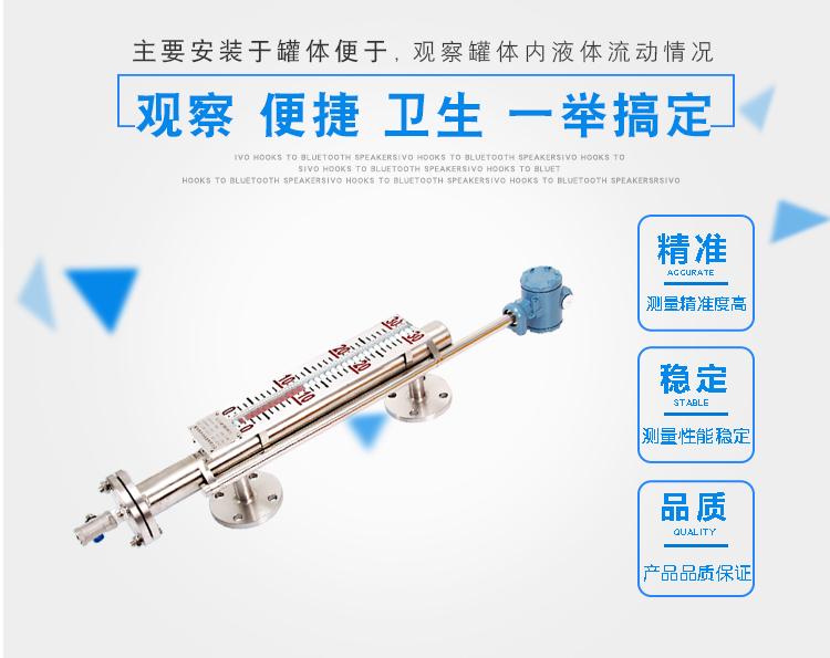 液位计根据浮力原理,浮子在测量管内随液位的升降而上下移动,浮子内的**磁钢通过磁耦合作用,驱动红、白色翻柱翻转180’液位上升时,翻柱由白色转为红色,下降时,翻柱由红色转为白色,从而实现液位的指示。