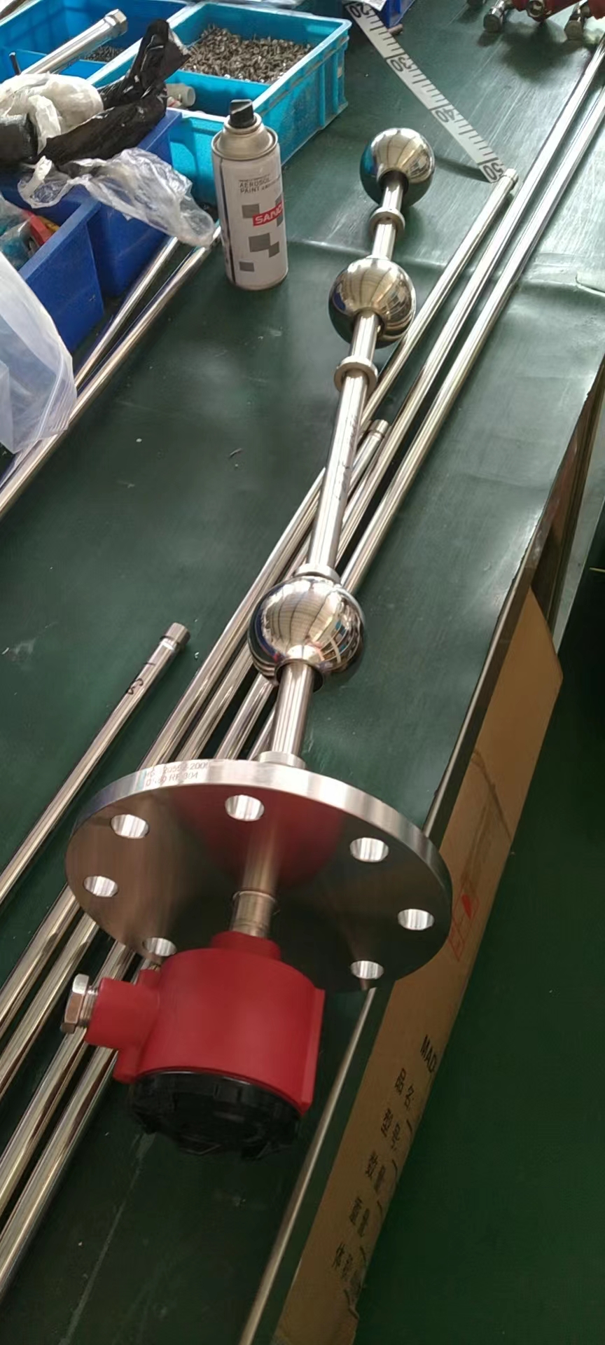浮球液位计通过连接法兰安装在容器顶部。浮球根据排出液体体积相等的原则浮在液位上。当容器的液位发生变化时,浮球也会上下移动。由于磁效应,浮球液位计的干弹簧被磁力吸引,将液位位置转换为电信号,并通过显示仪表