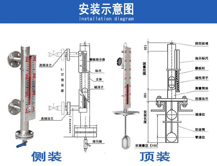 安装一般要求:如果您所需要的液位计连接法兰与我公司的规格、或其它标准(我公司法兰规格参照 HGT20592 ~ 20635 -- 2009 )有所不同,请在订货时说明我们可以根据您的实际要求供应。磁性翻转板液位计测量范围为两个连接法兰的中心距离(顶装式除外),其中下连接法兰中心为仪表指示的零点:您应保证设备上的连接法兰端面具有适当的平面度、垂直度和中心距离,以保证本公司产品的安装和使用。浮子室(或主管道)应保持清洁,无杂质,特别是无铁磁性物质。介质不干净时,应增设吸附或过滤装置,以保证仪器正常运行。