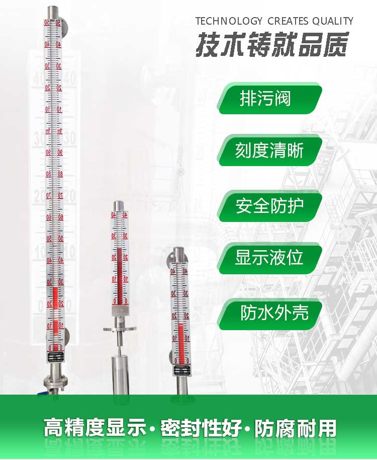 磁翻板液位计的安装、使用和维护。安装磁翻板液位计筒体内不允许有铁屑、焊渣等异物进入,以免卡死浮子,液位仪必须垂直安装。(┴≤30°)。液位计与容器之间应安装一个截止阀,使维修清洗时液体物料处于关闭状态,液位仪周围不允许有强磁场,以免影响正常工作。